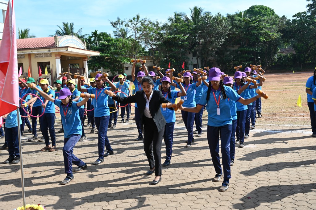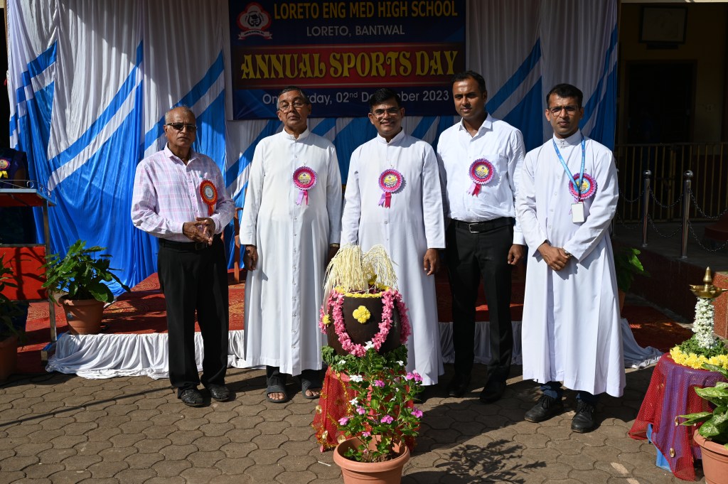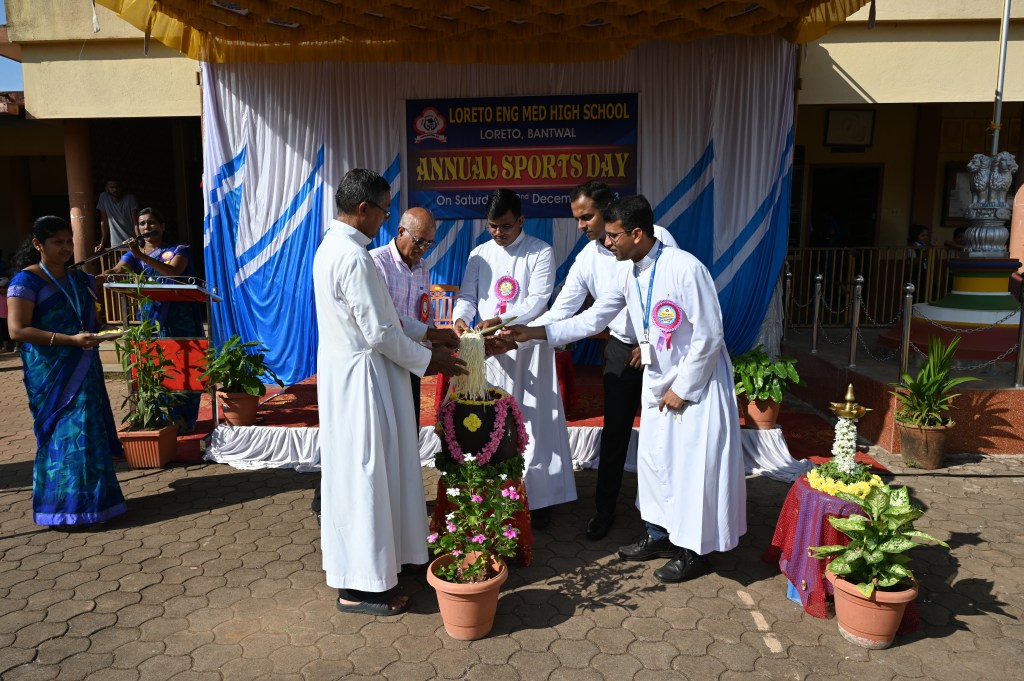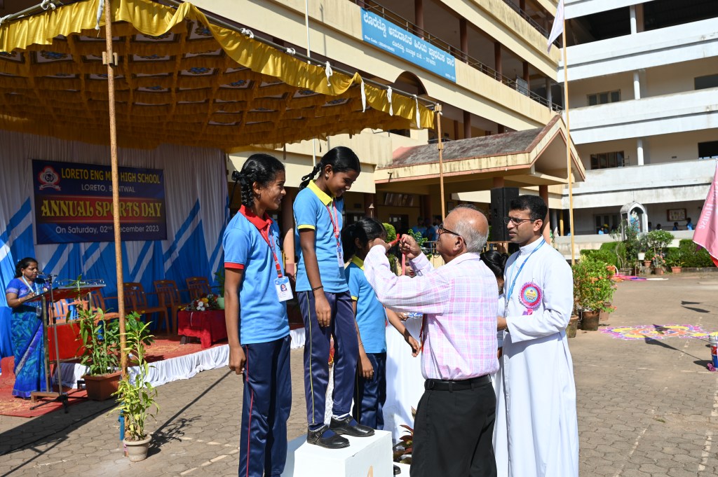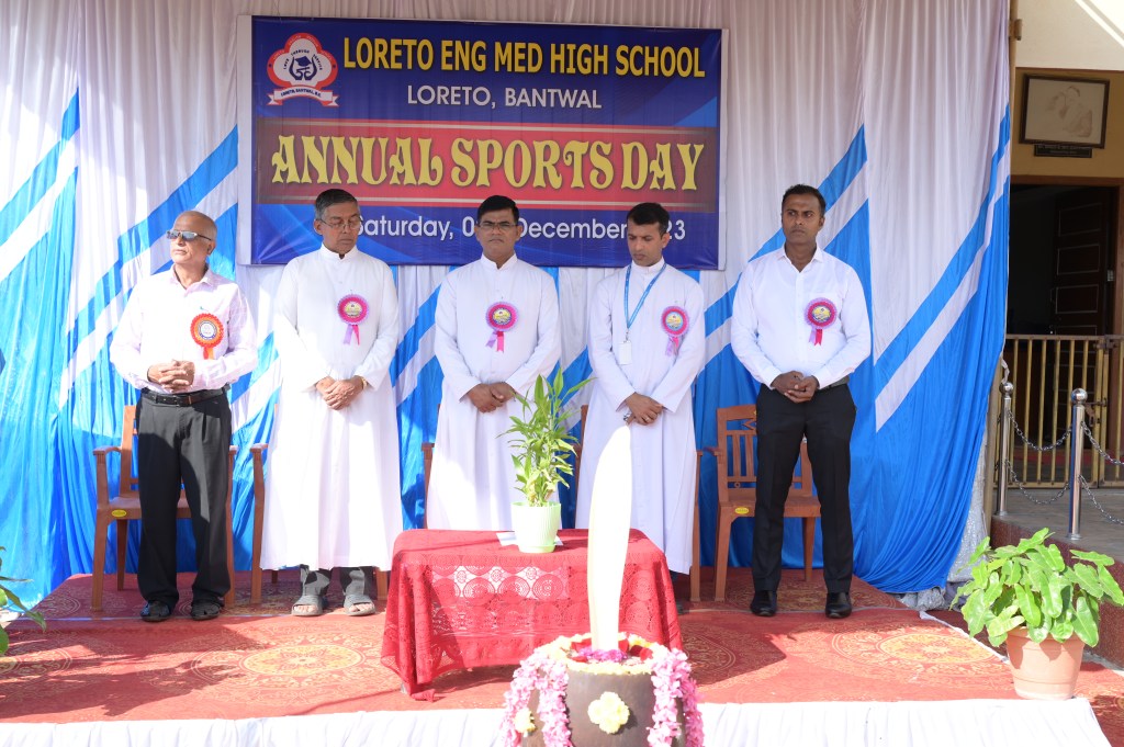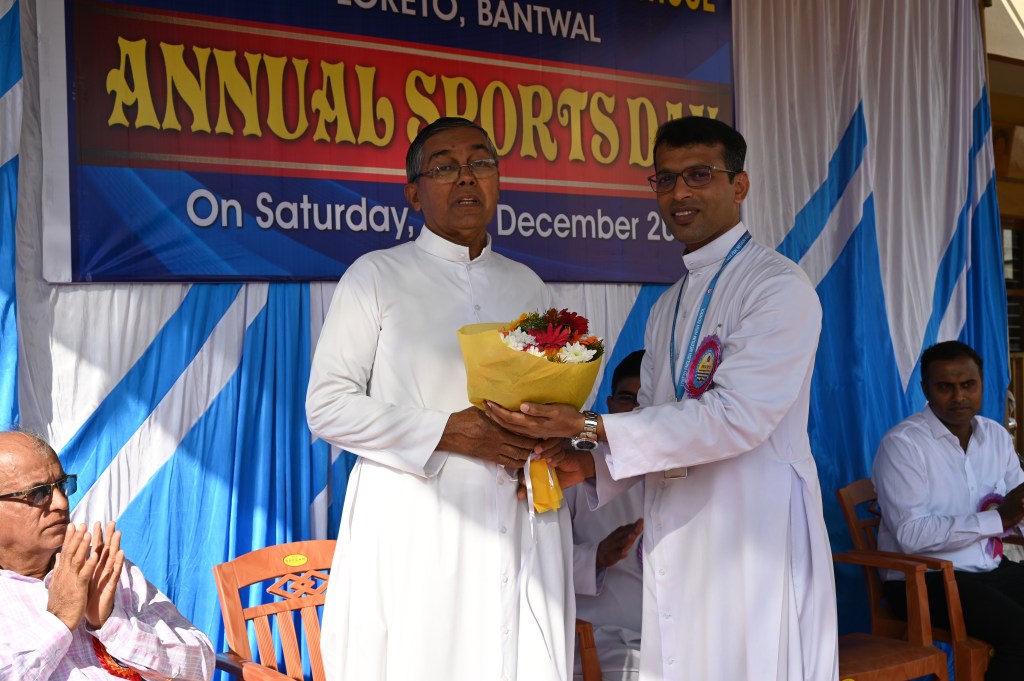 Dec 2: Bantwal: “Sports give power and strength, and if you want to be the best, you have to learn how to handle the worst.” With the same thought spectacular event of the school Annual Sports Day 2023-24 was inaugurated with great enthusiasm. President Rev Fr Francis Crasta Joint Secretary for the Loretto Eng Med School, Chief Guest Rev Fr Valerian Dsouza Parish Priest Infant Jesus Church Modankap, Mr Cyprian Dsouza Vice President Parish Council, Mr Sachin Noronha PTA Vice President were Present on the Dias. The guests were escorted by the school band followed by the March fast. Students walked rhythmically to the band beats and the school flag was brought in procession which was hoisted later. The school children invoked the Gods blessings through the prayer. The students performed the drill using hoops, dumbbells and laicism.