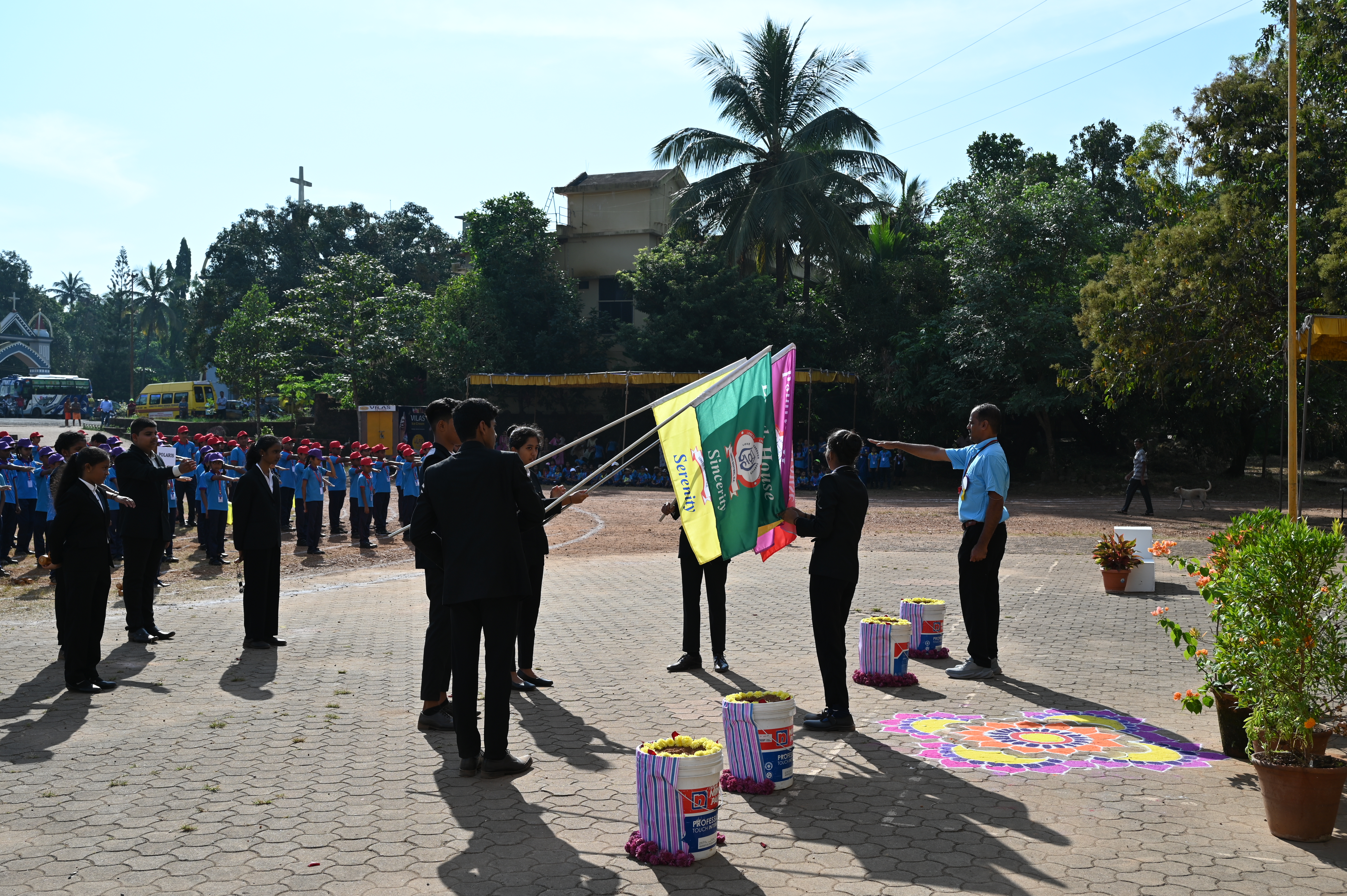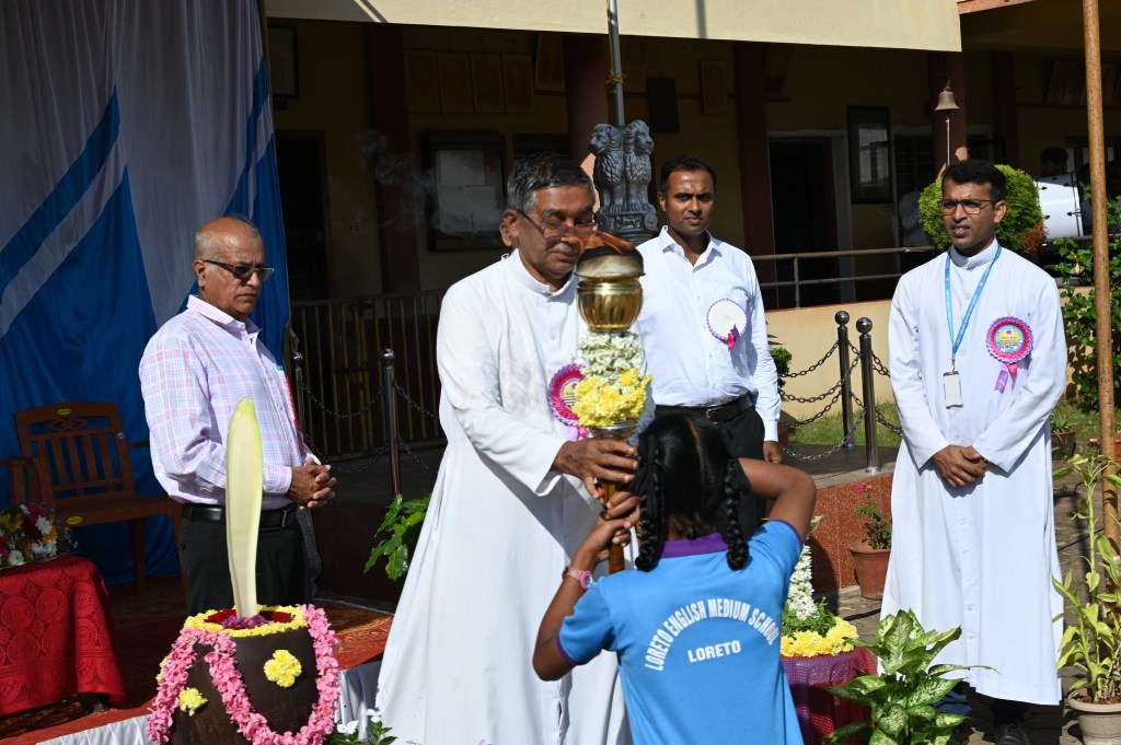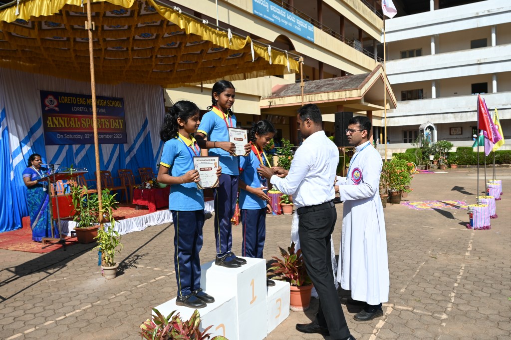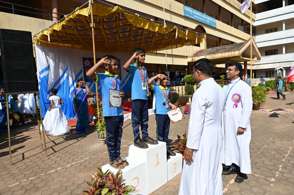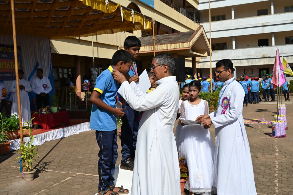 Dec 2: Bantwal: “Sports give power and strength, and if you want to be the best, you have to learn how to handle the worst.” With the same thought spectacular event of the school Annual Sports Day 2023-24 was inaugurated with great enthusiasm. President Rev Fr Francis Crasta Joint Secretary for the Loretto Eng Med School, Chief Guest Rev Fr Valerian Dsouza Parish Priest Infant Jesus Church Modankap, Mr Cyprian Dsouza Vice President Parish Council, Mr Sachin Noronha PTA Vice President were Present on the Dias. The guests were escorted by the school band followed by the March fast. Students walked rhythmically to the band beats and the school flag was brought in procession which was hoisted later. The school children invoked the Gods blessings through the prayer. The students performed the drill using hoops, dumbbells and laicism.