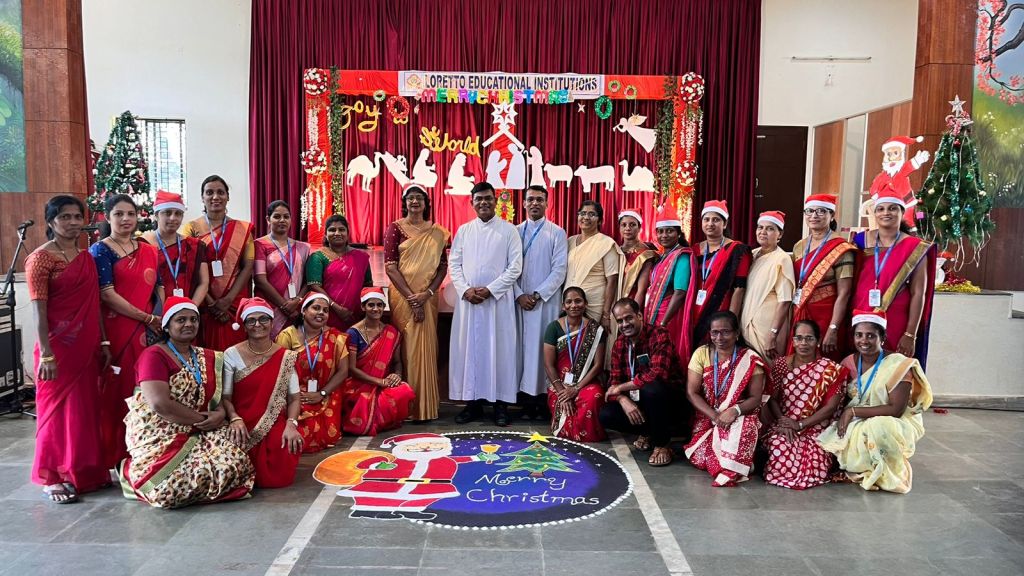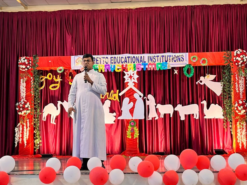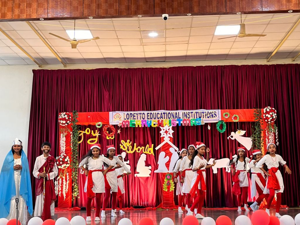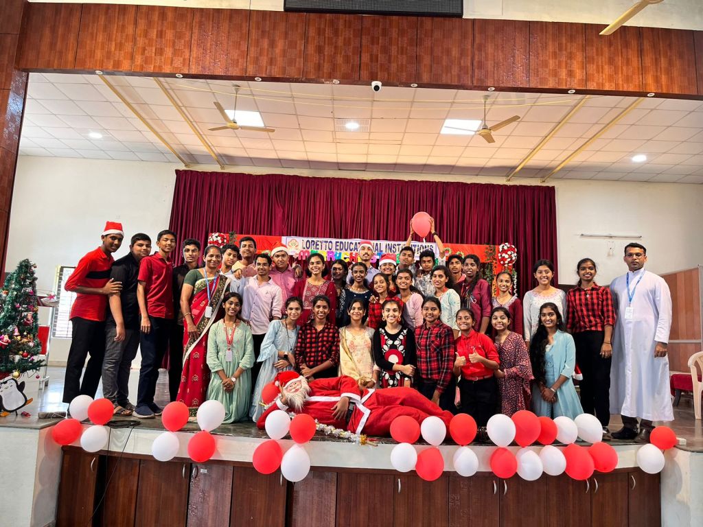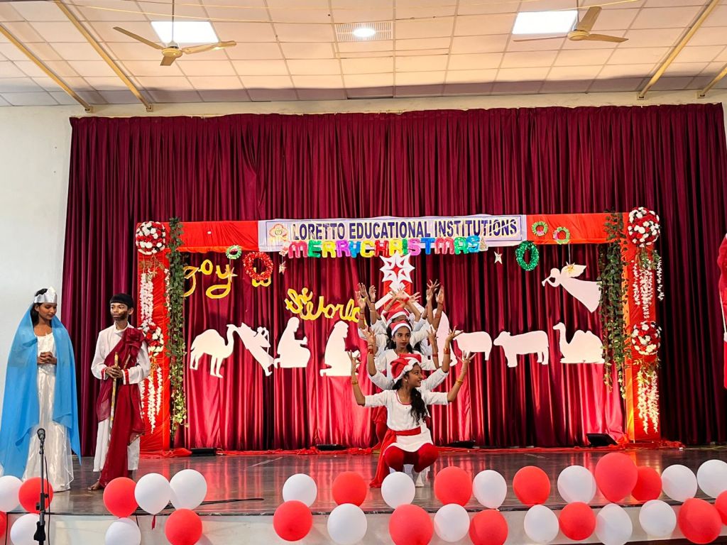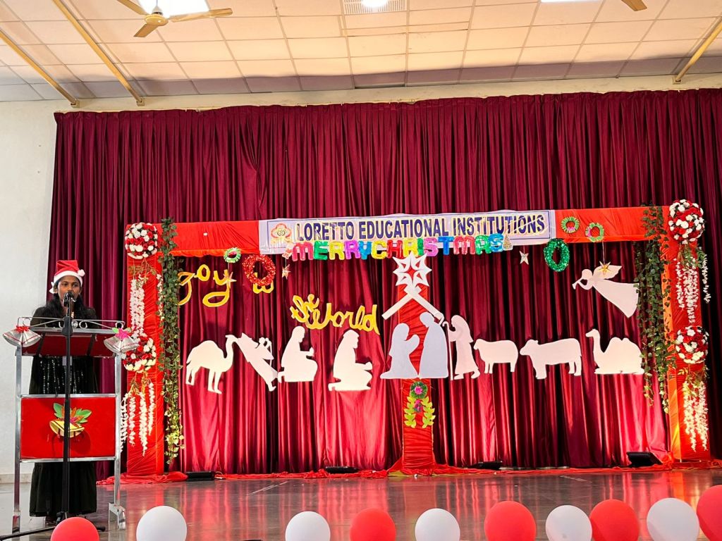 On 23/12/2023, Christmas Celebration was conducted by Loreto Educational Institutions at Loreto Matha Sabha Bhavan. The dignitaries of the programme were The Correspondent Rev.Fr. Francis Crasta, P.T.A Vice President Mr. Sachin Noronha, Our School Principal Rev.Fr. Jason Vijay Monis, Sr.Idoline Rodrigues The Headmistress of Aided Higher Primary school, Loreto. The program started with the prayer to invoke the blessing of God .”To chase the darkness, Jesus Christ came to this world by bringing joy, peace and happiness. “AS a symbol and light, the dignitaries lightened the lamp and celebrated Christmas by cutting the special cake. Guests delivered the message and wished all the gathering. The students performed various cultural activities. The entry of Santha Claus to the tune of Christmas carols took the students by surprise. It was a joyous experience for the students which added a little more glitter to the celebration. Infront of the stage, the Rangoli was drawn by the students. It was fantastic and appreciated by all. The stage was beautifully decorated and everybody was dressed in red.