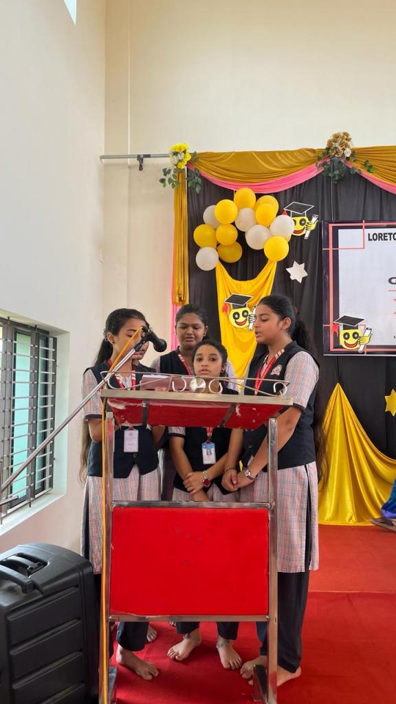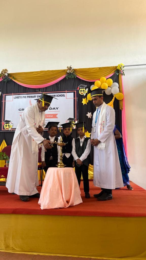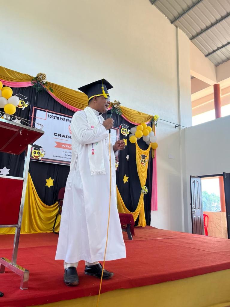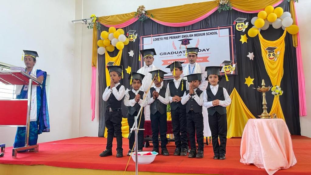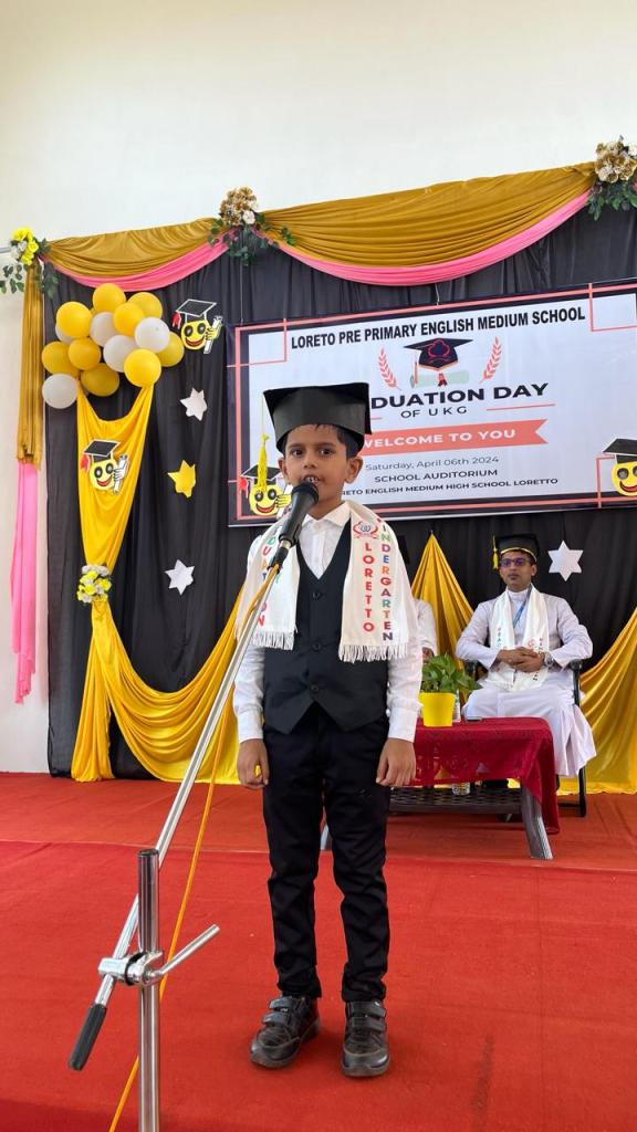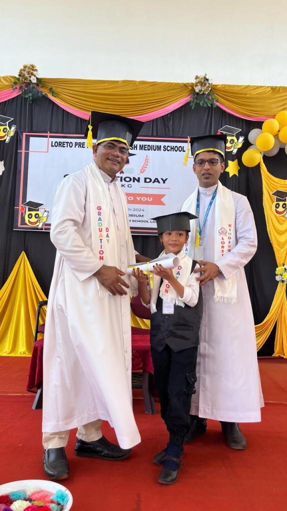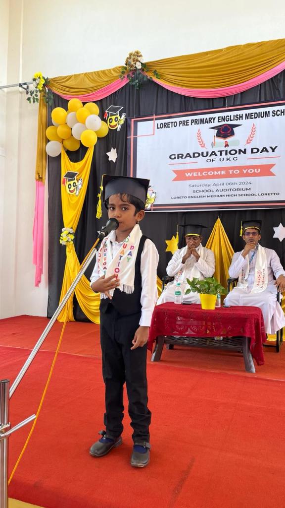 The celebration began with seeking of divine blessings by prayer song. Mrs. Jyothi Dsouza extended greeting to all the attendees. The dignitaries lighten up the lamp as a symbol of inviting illuminating wisdom into our midst. The Correspondent Rev. Fr. Francis Crasta and The Principal Rev. Fr. Jason Vijay Monis honored with a shawl and certificate. Our School Principal Rev. Fr. Jason Vijay Monis addressing the gathering, congratulated the students and encouraged them to continue their journey of learning and growth. On this joyous occasion graduates are expressed their happiness with the “Graduation Song”. Mast. Vion Rodrigues and Baby Lenora Arleen Pinto shared their experiences, gratitude and beautiful memories. The School Correspondent Rev. Fr. Francis Crasta congratulated the students by comparing them to the stars, shining like a precious diamond. The program was anchored and proposed vote of thanks by Mrs. Jacintha Moras. Refreshment were served to all at the end of the program. The program was winded up with a School Anthem.