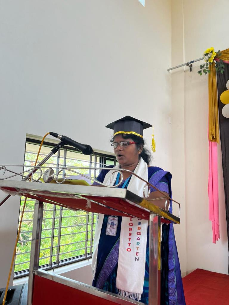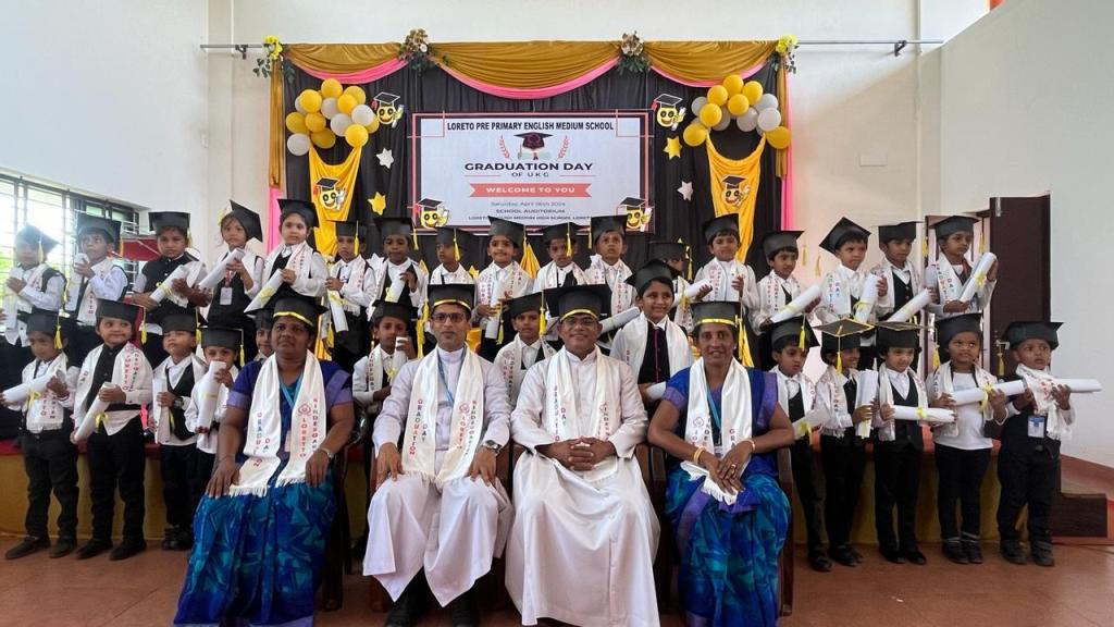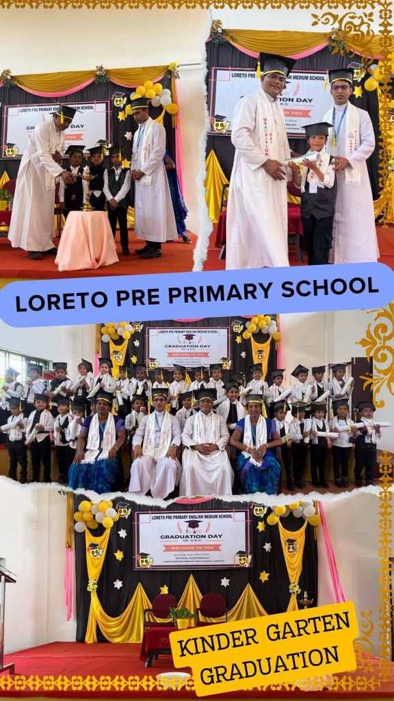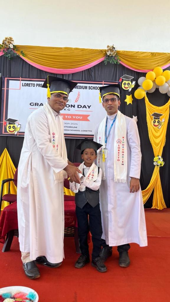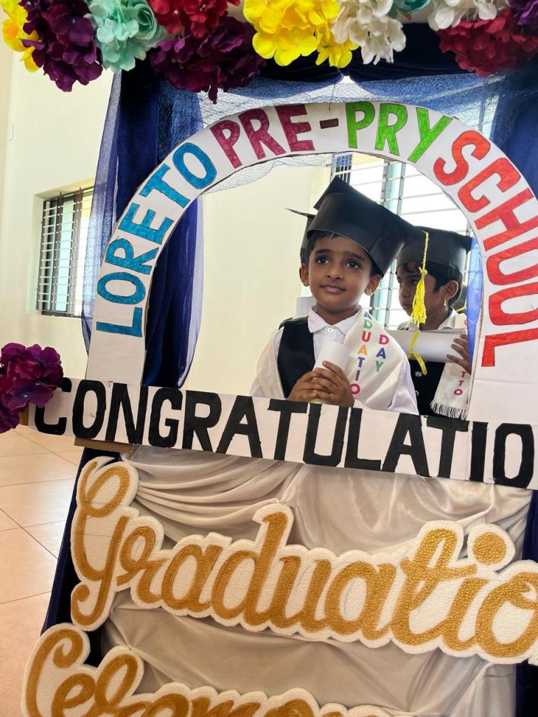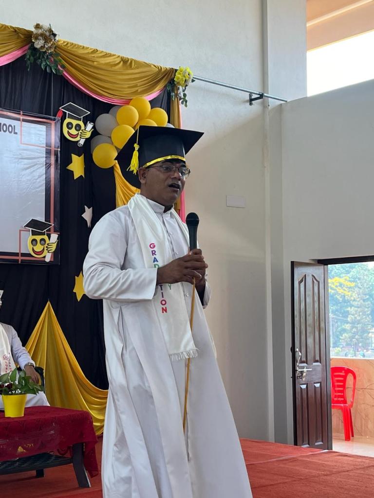 The celebration began with seeking of divine blessings by prayer song. Mrs. Jyothi Dsouza extended greeting to all the attendees. The dignitaries lighten up the lamp as a symbol of inviting illuminating wisdom into our midst. The Correspondent Rev. Fr. Francis Crasta and The Principal Rev. Fr. Jason Vijay Monis honored with a shawl and certificate. Our School Principal Rev. Fr. Jason Vijay Monis addressing the gathering, congratulated the students and encouraged them to continue their journey of learning and growth. On this joyous occasion graduates are expressed their happiness with the “Graduation Song”. Mast. Vion Rodrigues and Baby Lenora Arleen Pinto shared their experiences, gratitude and beautiful memories. The School Correspondent Rev. Fr. Francis Crasta congratulated the students by comparing them to the stars, shining like a precious diamond. The program was anchored and proposed vote of thanks by Mrs. Jacintha Moras. Refreshment were served to all at the end of the program. The program was winded up with a School Anthem.