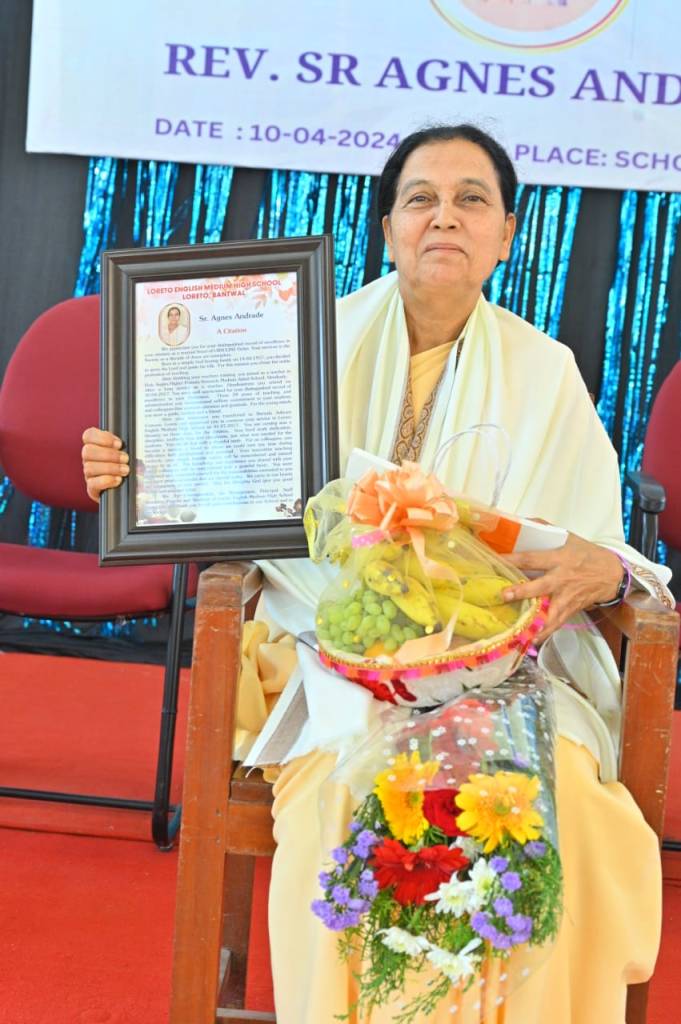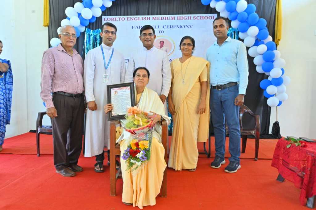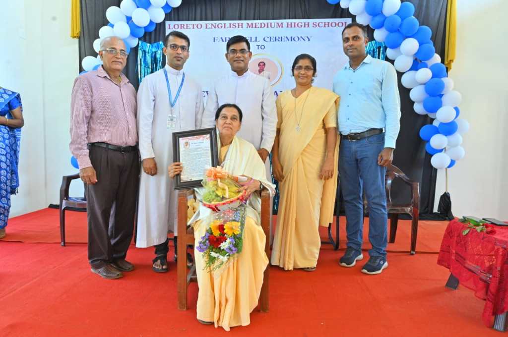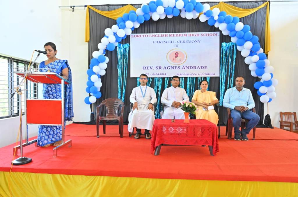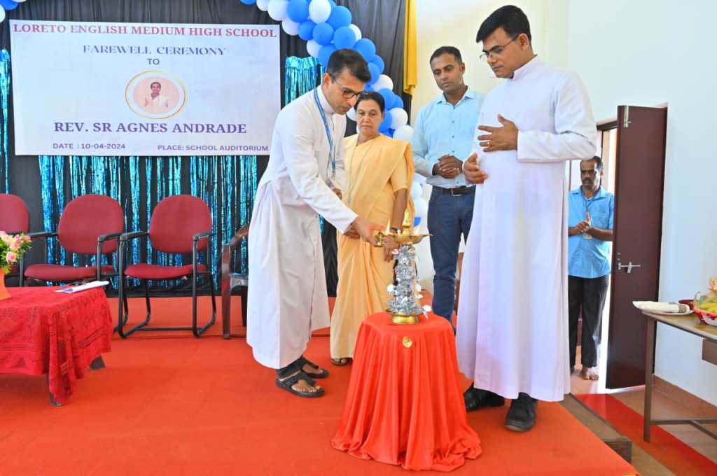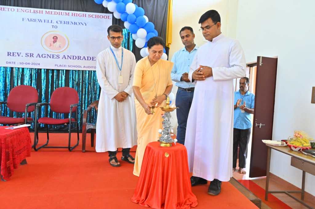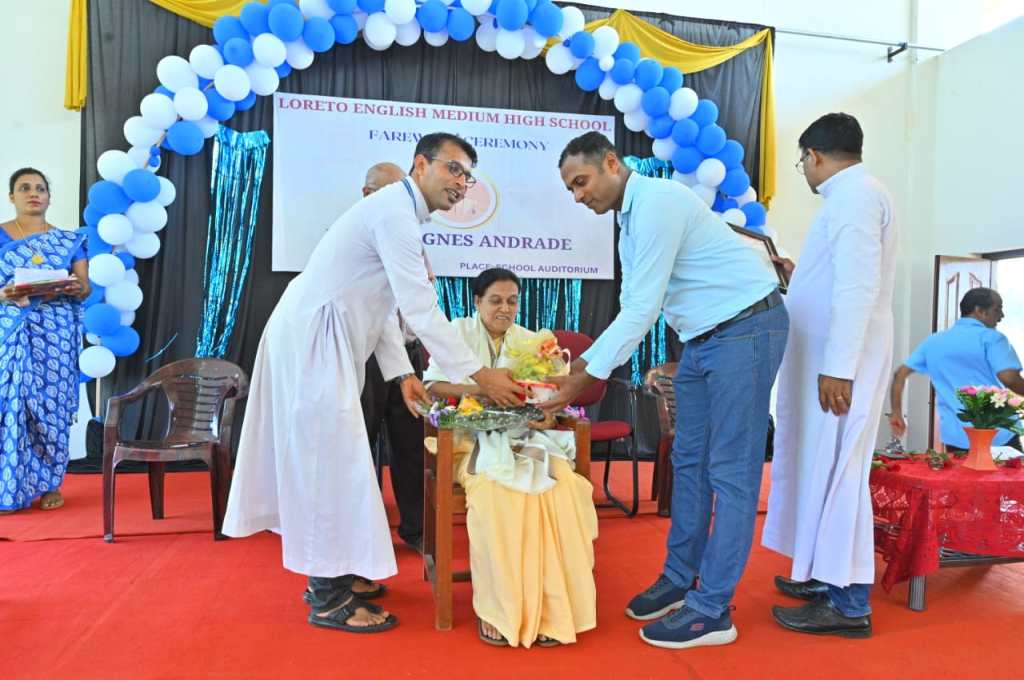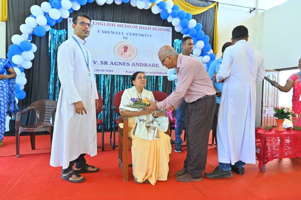 The farewell ceremony of our beloved Teacher Sr. Agnes Andrade was a heartwarming event that held on 10/04/2024 at 9:30 am in the school auditorium. The Correspondent Rev. Fr. Francis Crasta, Our School Principal Rev. Fr. Jason Vijay Monis, The Farewell Teacher Sr. Agnes Andrade,Mr. Cyprian Dsouza Vice President of Parish Council, and Mr. Sachin Noronha P.T.A. Vice President were the dignitaries. The ceremony commenced with invoking God’s grace through a prayer song, sang by school choir group. The programme was inaugurated by lightning the lamp is s symbolizing gesture of invoking blessings and positive energy for the event. Our School Principal Rev. Fr. Jason Vijay Monis extended a warm welcome to the gathering. The citation conveyed by Mrs. Voilet Rodrigues. Then, honoured Sr. Agnes Andrade by all the dignitaries on the dias. Sr. Agnes Andrade expressed her feelings and gratitude towards School Management and Staff. The farewell song sang the school choir. The Correspondent Rev. Fr. Francis Crasta delivered a wonderful message to Sr. Agnes by comparing her to Mother Theresa, and also appreciated her teaching and charmless. The programme was anchored by Mrs. Philomena Pinto and Mrs. Vinitha Priya Dsouza thanked everyone.