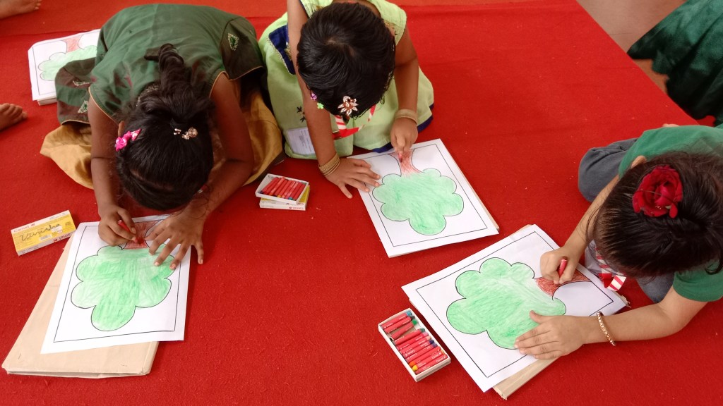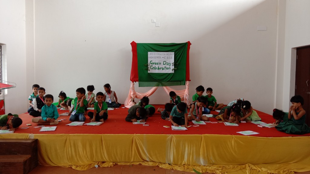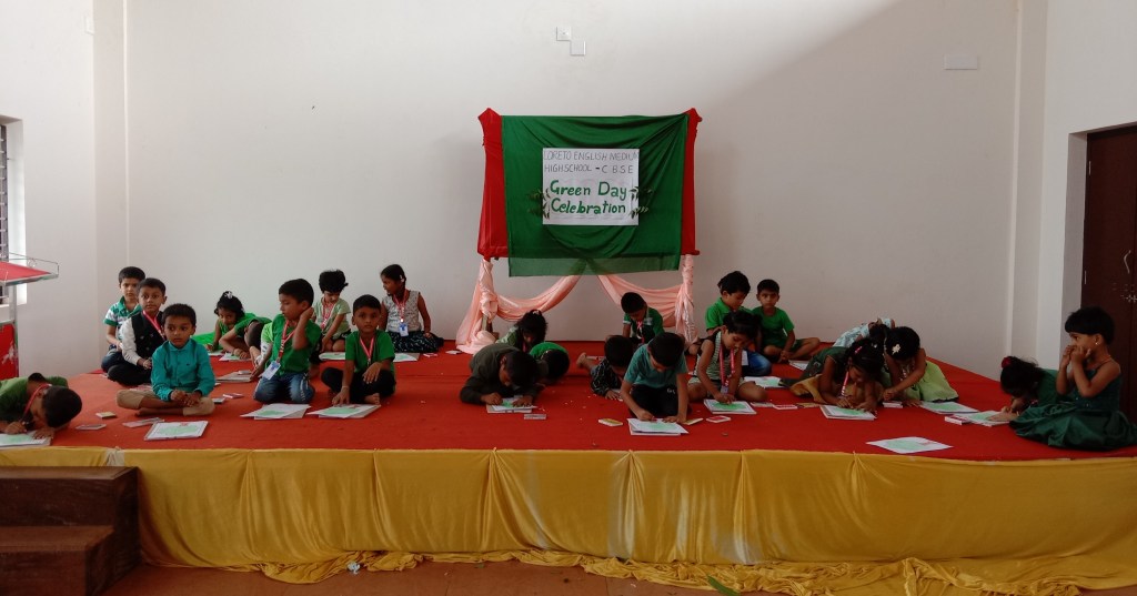 Loreto , Bantwal June: 12: ” Let’s nurture the nature. So that we can have a better future”As a part of colours day celebration, Loreto English Medium High School had “Green Day Celebration ” on 12th June,2024. The main objective of celebrating green day is to create an awareness about the earth and to cherish the greenery that we are blessed with. The School Auditorium was decorated with vegetables, fruits, leaves and green things. The students and Teachers had come in green dress. Our School Principal Rev.Fr. Jason Vijay Monis encouraged and enjoyed a movement with tiny tots. They expressed their gratitude towards the nature through activities like colouring the tree and made an apple with a crepe paper and paste it on the tree. Children enjoyed the day with sweets.