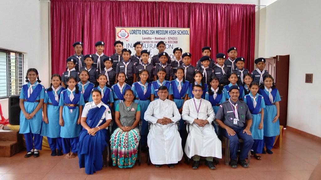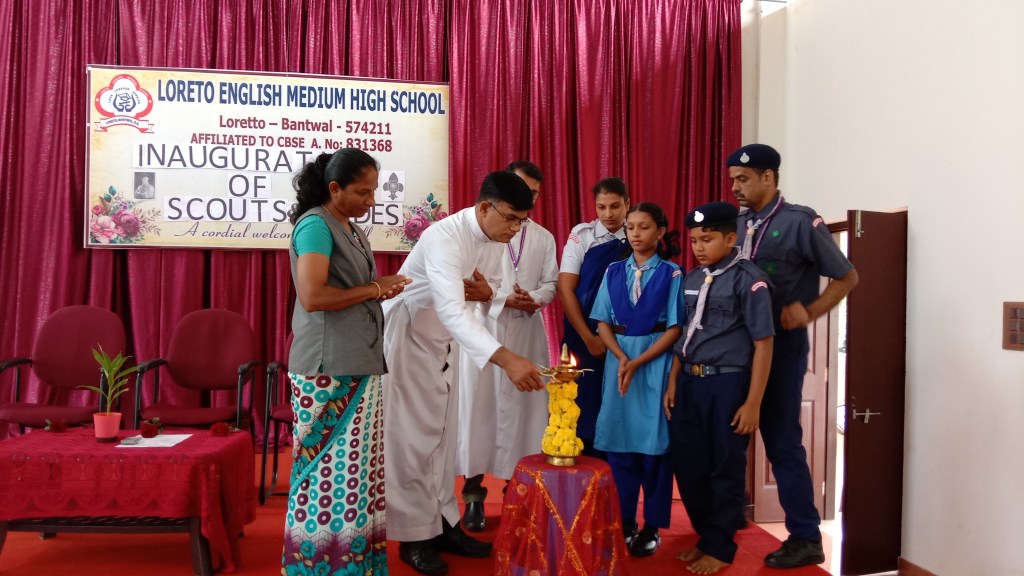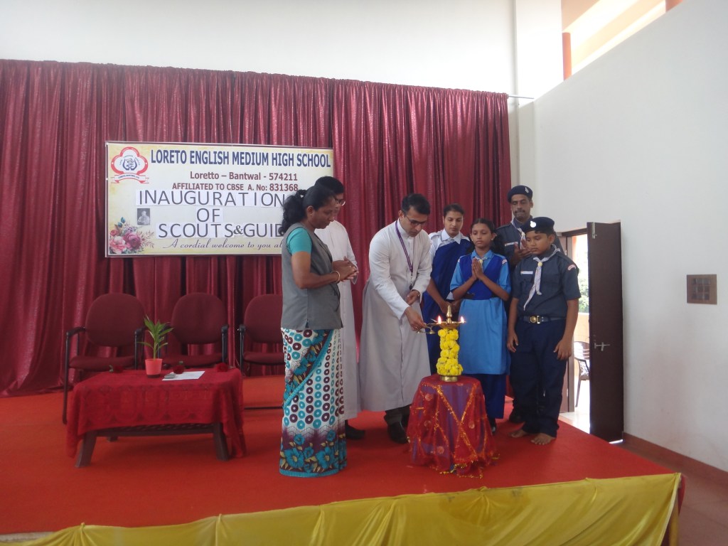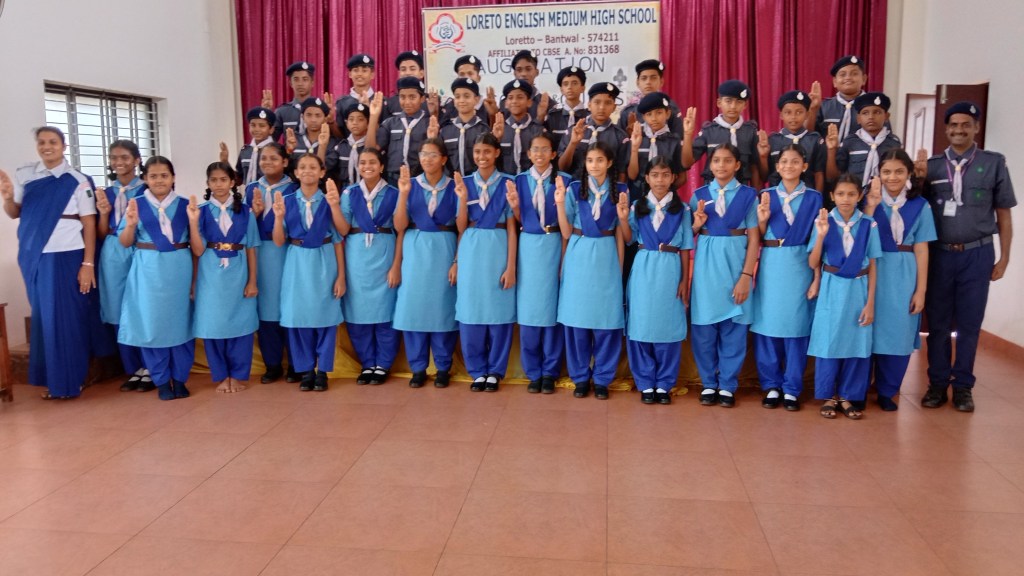 On 19 October 2024, Loreto English Medium High School marked a significant occasion with the inauguration of the Scouts and Guides event. The School Correspondent Rev. Fr. Francis Crasta, The School Principal Rev.Fr. Jason Vijay Monis and The Vice Principal Mrs. Anitha Shalini Pais were warmly welcome upon their arrival and escorted to the stage with great respect and enthusiasm, marking the official beginning of the Scouts and Guides inauguration ceremony. The event commenced with prayer song led by Scouts and Guides. The audience were warmly greeted by Varshini of Grade VIII. The Scouts and Guides inauguration ceremony was officially commenced with the dignitaries lightning the ceremonial lamp symbolizing the spirit of service. The significance of the program was read by the Mast. Ryan lobo of Grade VII. Later, Our School Principal Rev.Fr. Jason Vijay Monis spoke on the occasion, congratulated the initiatives Mr. Padmanabha Mayya and Mrs.Rovita Crasta, And expressed his happiness over this milestone in our school’s history. He emphasized, “the importance of doing a good term daily, reminding the students that these values are not just for scouts and guides, but for all. He encouraged everyone to respect nature, respect to each other