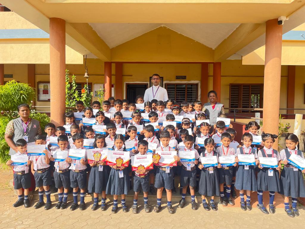 Prasad Book Distributors organized Inter School Merry Christmas Colouring Competition at Loreto English Medium High School on 19th December 2024, for LKG and UKG sections. Winners are namely, In LKG Advika. N secured first place and Jonathan Veigas secured second place. In the UKG Prathith Sharath Shetty secured first place and Rianna Olivia Mendes secured second place. Our School Principal Rev. Fr. Jason Vijay Monis distributed the Prizes and Certificates to the winners. He appreciated the efforts of all the young learners, for their tremendous achievements and enthusiasm. Our School Correspondent Rev. Fr. Francis Crasta and The Principal Rev .Fr. Jason Vijay Monis thanked Prasad Book Distributors for conducting the competition.