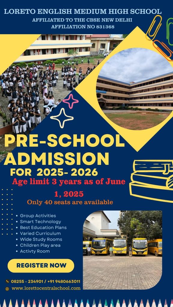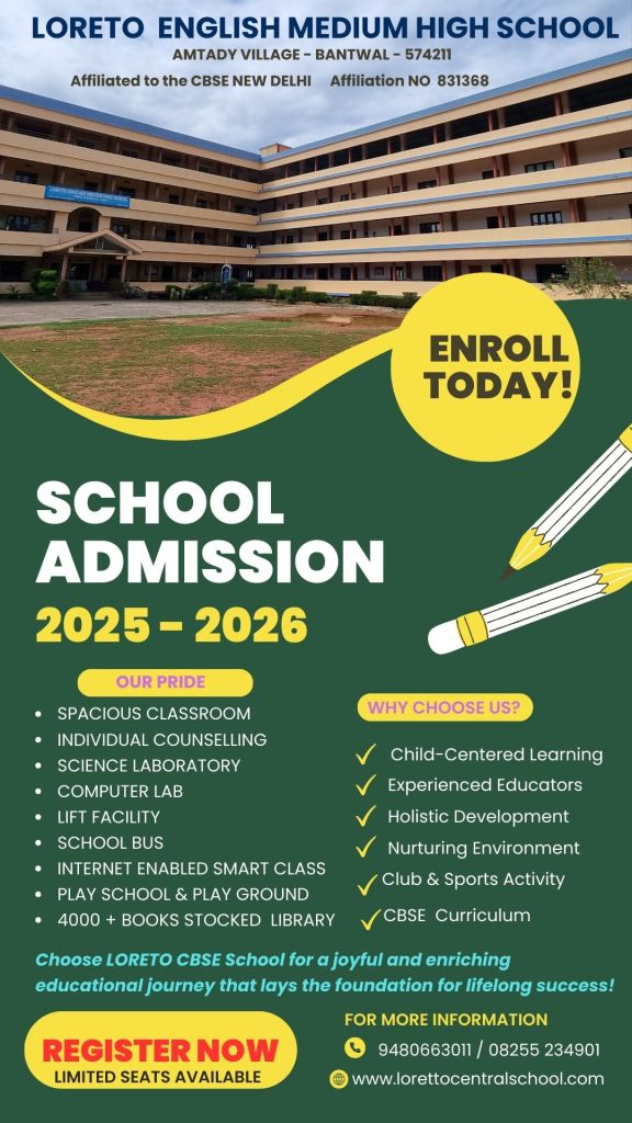 Loreto English Medium High School has stared in the year 2010 and till now the 11 batches have passed out with the 100% result in the 10th standard. From the past two years it has secured 1st place among the CBE school which is run under the Diocese of Mangalore. The school has all the modern facility that meets the parameters laid by the CBSE.