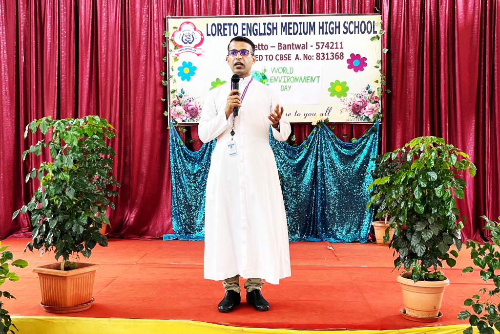 The School Principal, Rev. Fr. Jason Vijay Monis, addressed the students and shared his thoughts on environmental responsibility. He reminded everyone that we are alive because of Mother Earth, and it is our duty to protect her. He urged students to avoid plastic usage, not to throw chocolate wrappers carelessly, and to practise cleanliness starting from home.