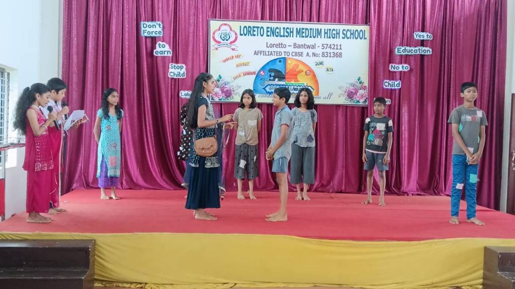 Loreto English Medium High School observed World Day Against Child Labour with a special programme organized and presented by the students of Grade 6, which included a role play, a skit, and a dance performance accompanied by impactful slogans. The performances reflected the theme of the day and highlighted the need to eradicate child labour.