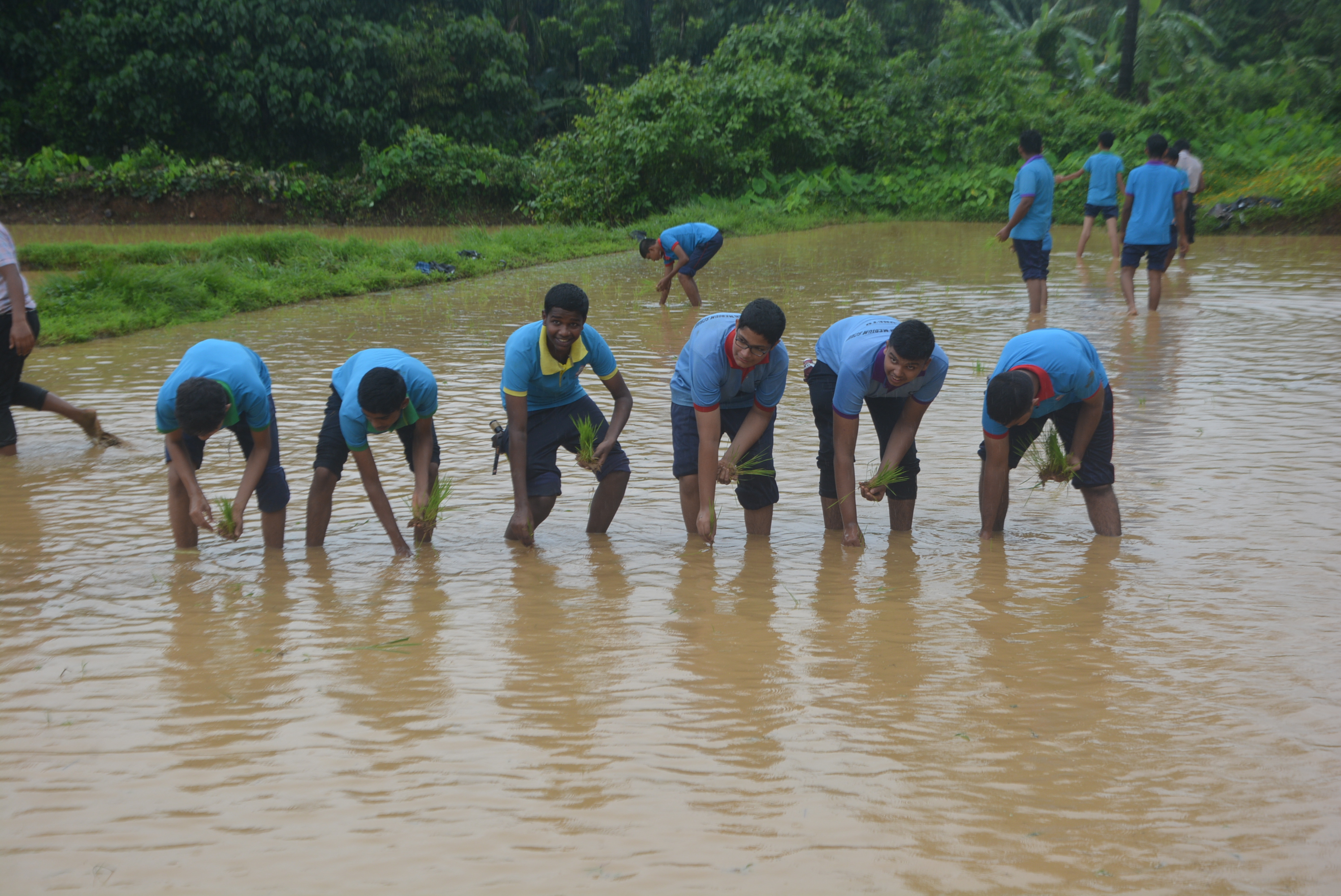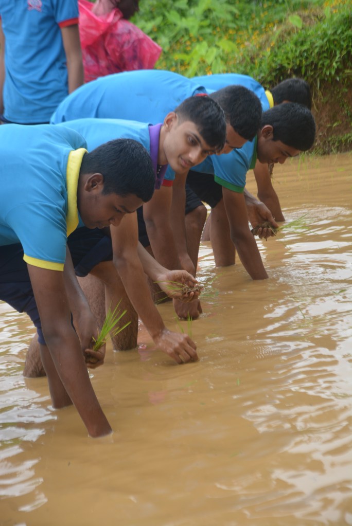 At the field, the Principal explained the process of soaking paddy seeds in preparation for planting. Mr. Jerald Pinto and Mrs. Sunitha demonstrated the correct method of planting paddy saplings. The students, along with their teachers, enthusiastically stepped into the field and participated in the planting process.