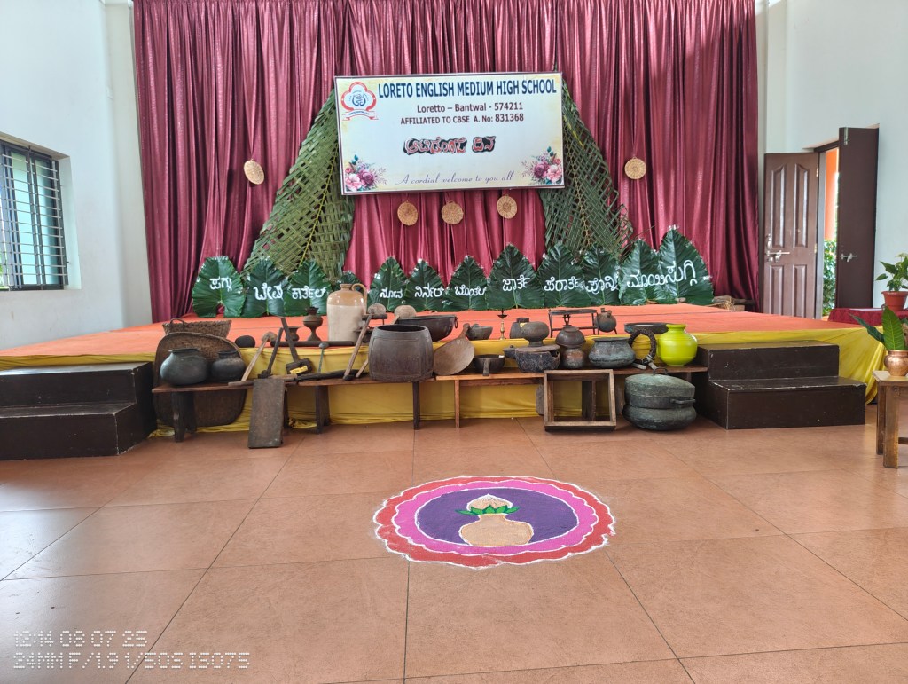 The stage decoration beautifully reflected rural Tulunadu with traditional kitchen utensils, wooden tools, palm baskets, and rustic elements, creating an immersive and authentic atmosphere for the event.