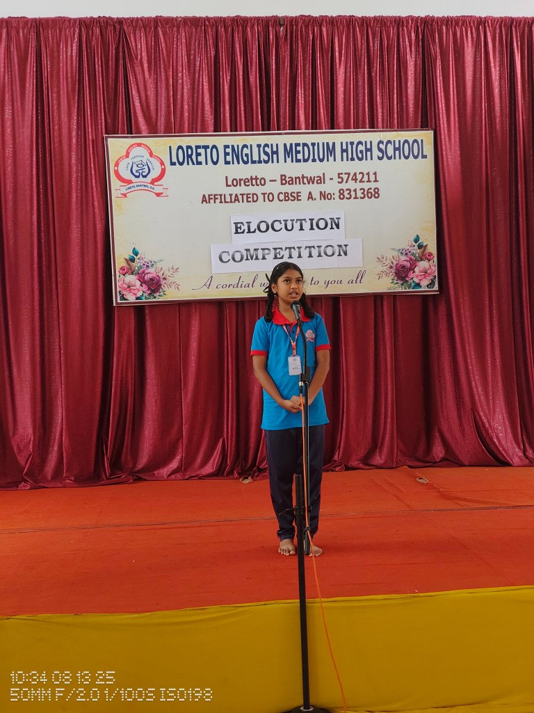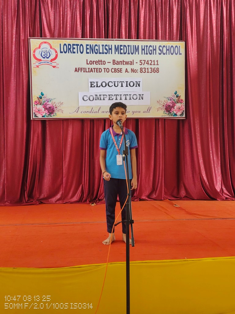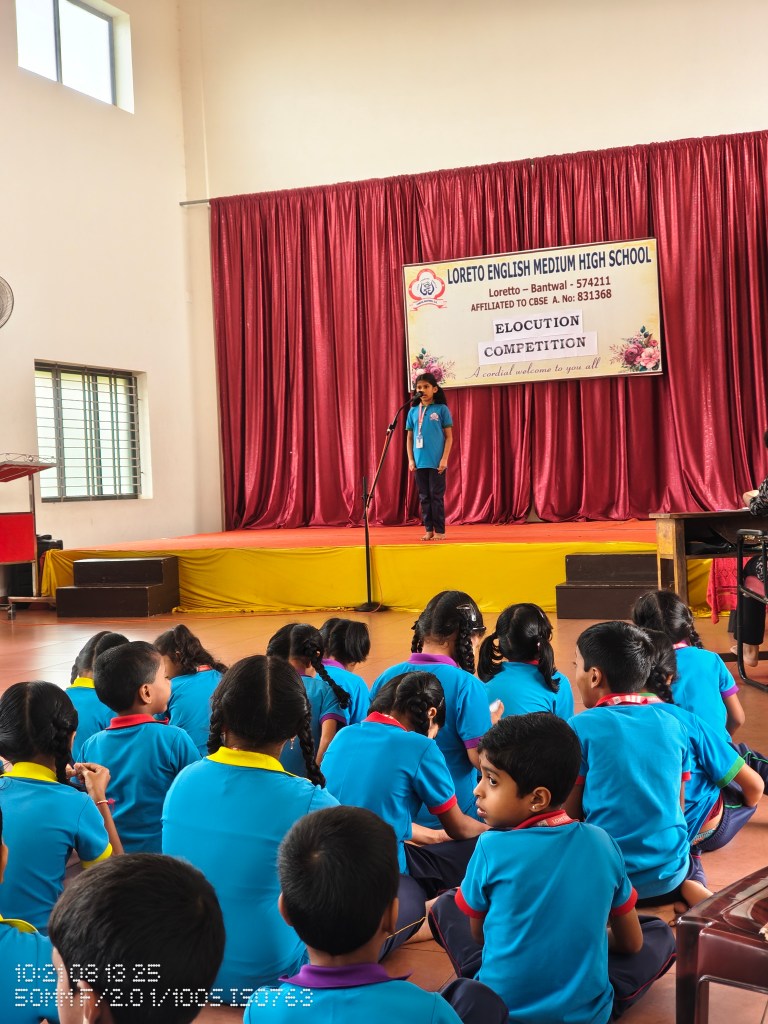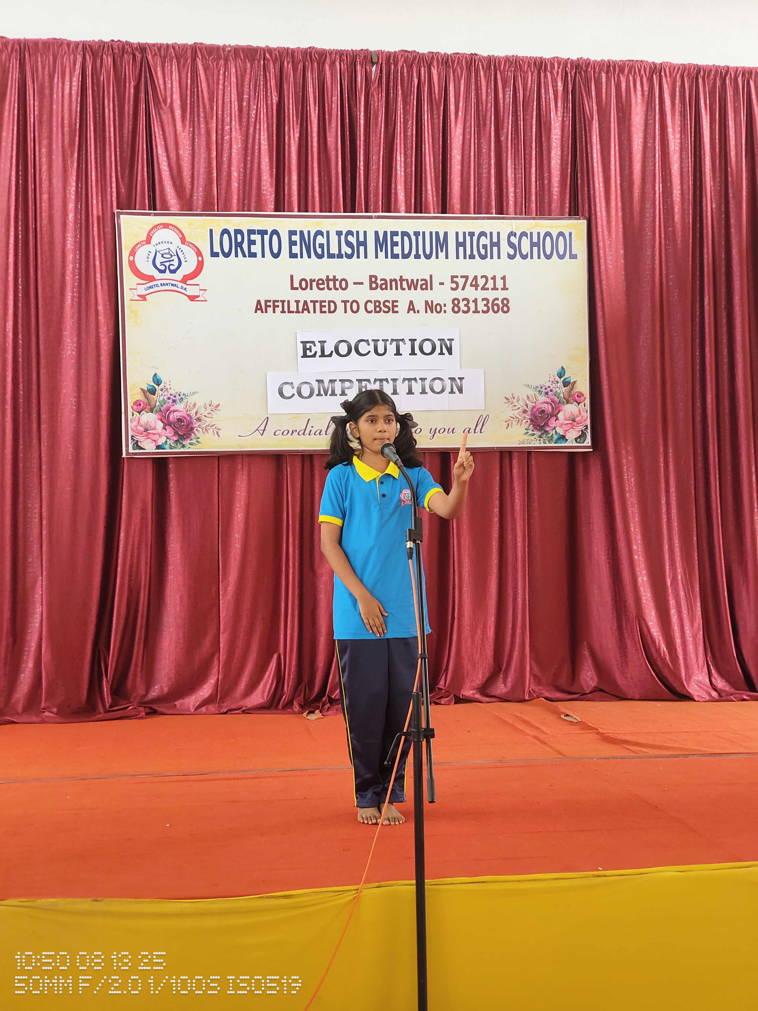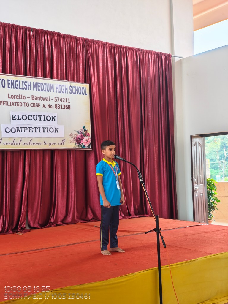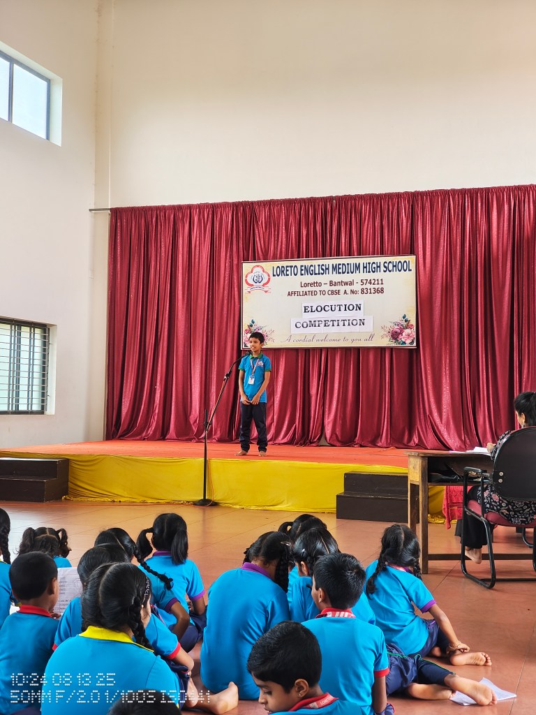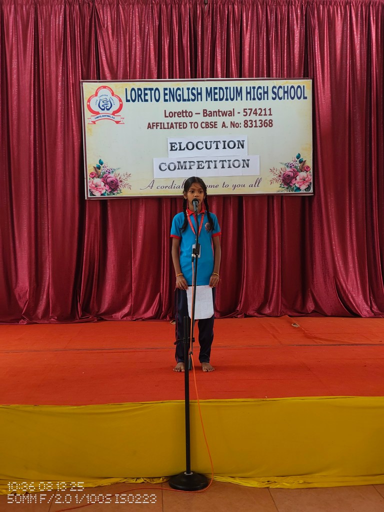 Loreto English Medium High School organised an Elocution Competition for students from Grades 1 to 10 in the school auditorium. The event aimed to develop students’ public speaking skills and encourage them to express their thoughts on themes related to patriotism and national pride. Different topics were assigned to different grades, ensuring that the speeches were age-appropriate and thought-provoking.