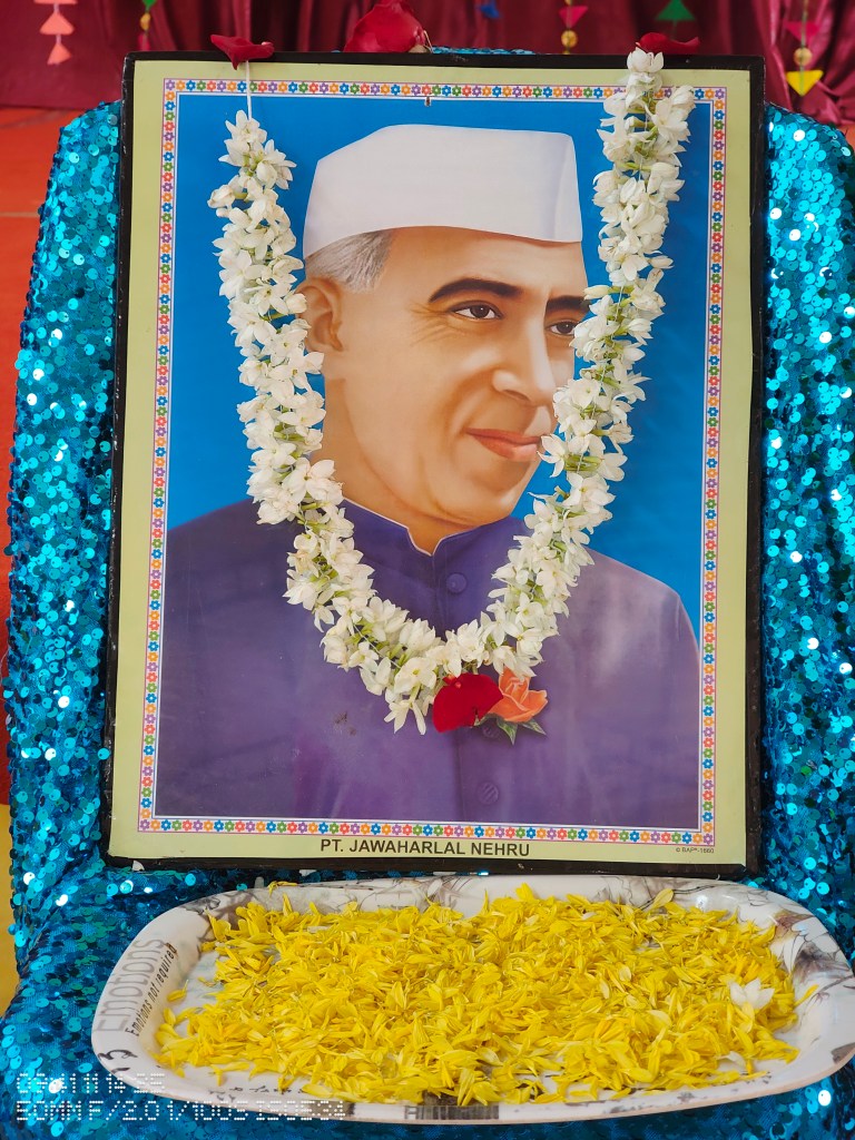 The celebration began with a prayer song presented by the teachers, followed by a welcome dance. The dignitaries inaugurated the event by lighting the lamp, after which a floral tribute was offered to the portrait of Pandit Jawaharlal Nehru.
