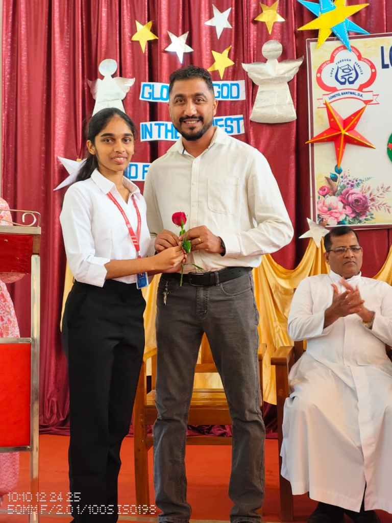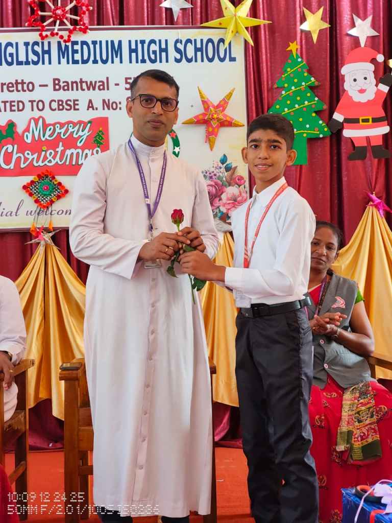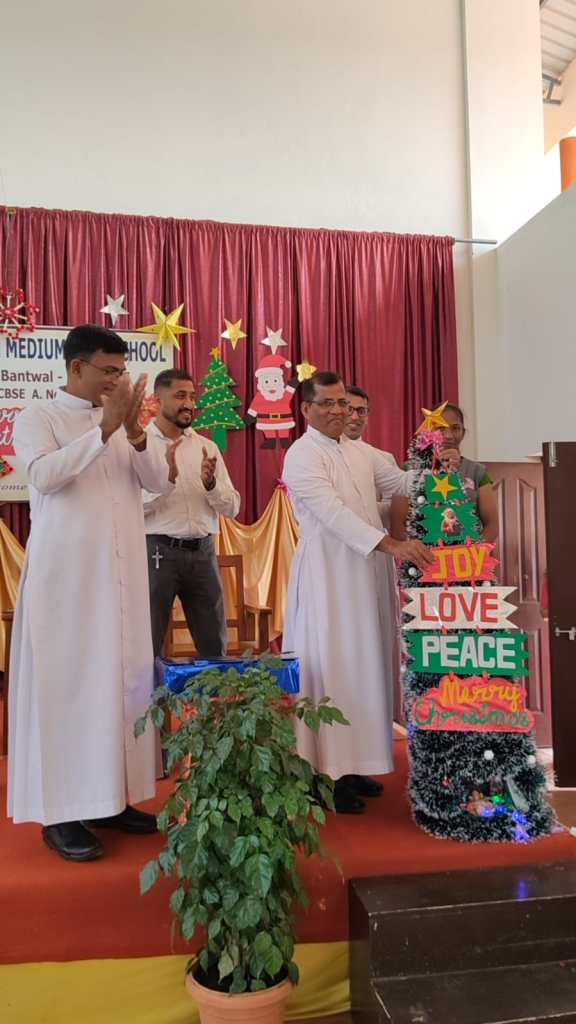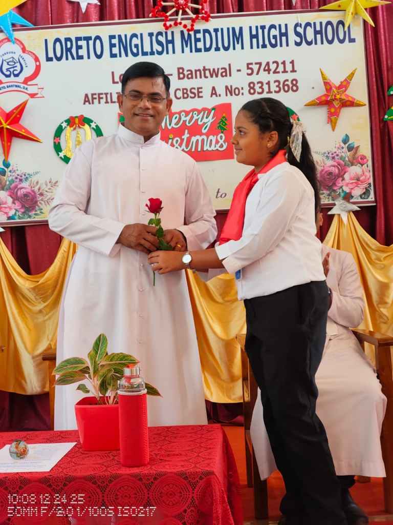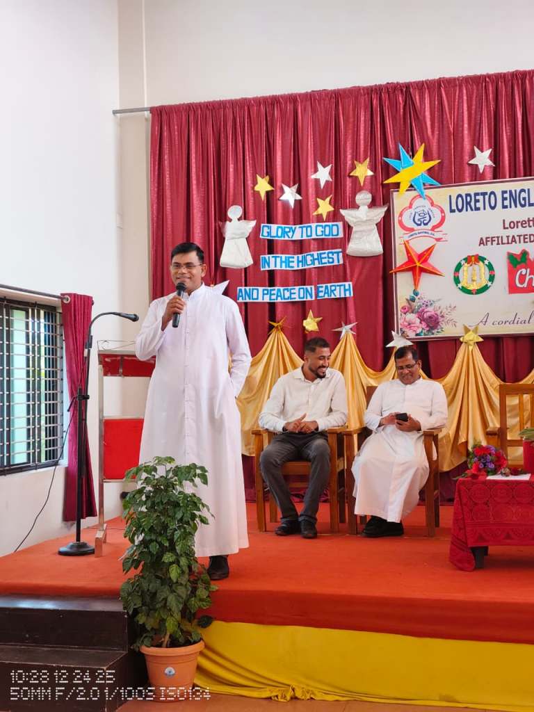 Rev. Fr. Melwin Lobo wished everyone a Merry Christmas and spoke about the birth of Jesus and the powerful message it gives to humanity love, hope, humility, and service to others. He encouraged students to follow these values in their daily lives.