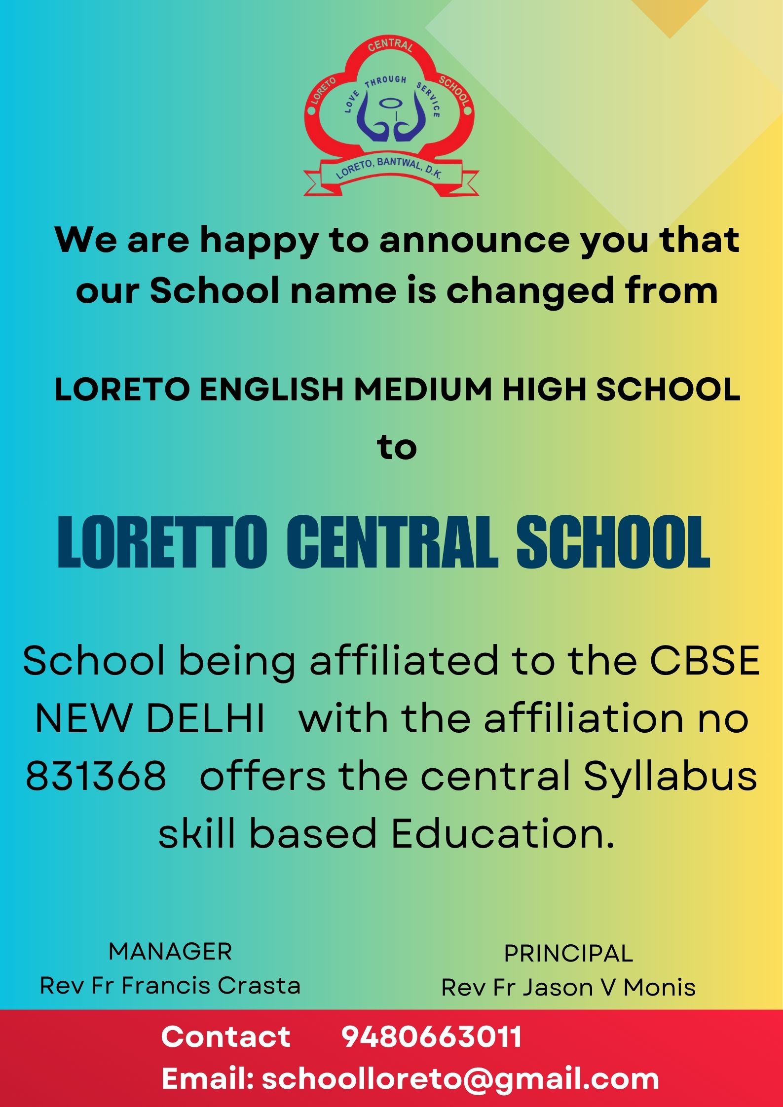 Loretto Jan: 05 The management today has announced that the name of the School is changed as LORETTO CENTRAL SCHOOL from Loreto English Medium High School with the effect from 06/01/2026. The CBSE has issued the letter with the Reference NO : CBSE/831368/CN-00592-2627/2026-27.